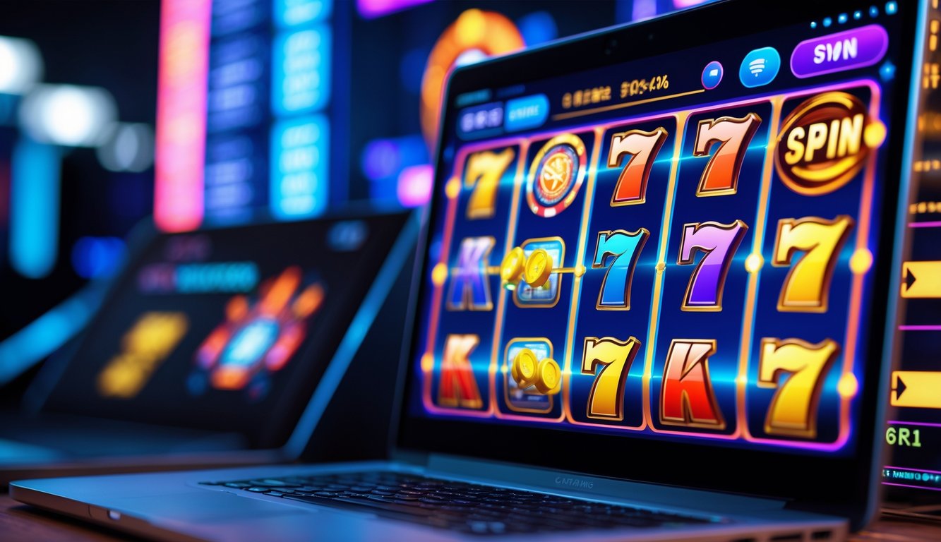 Seseorang sedang bermain permainan slot online di komputer dengan tampilan gulungan warna-warni yang berputar cepat.